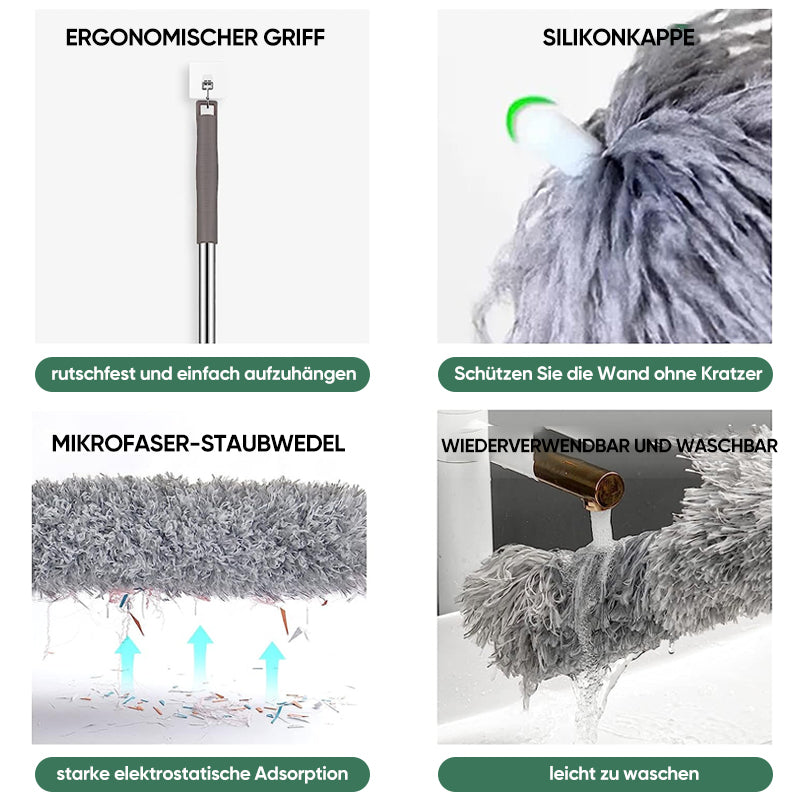 • Leicht zu reinigen und aufzubewahren: Unser Staubwedelkopf ist abnehmbar. Sie können ihn mit warmem oder leicht heißem Wasser von Hand waschen, trocknen und aufbewahren.