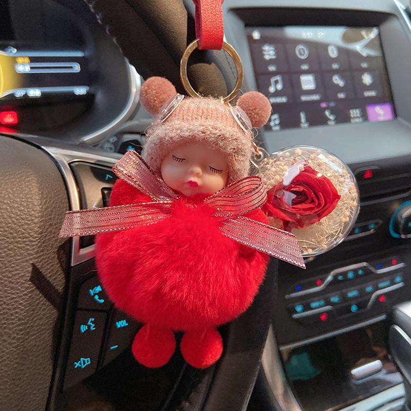 • Material: künstliche Fuchs- / Kaninchenfellimitation, Himmelstern-Trockenblume, Metall-Schlüsselbund, süßes Baby aus Silikon + Wollmütze